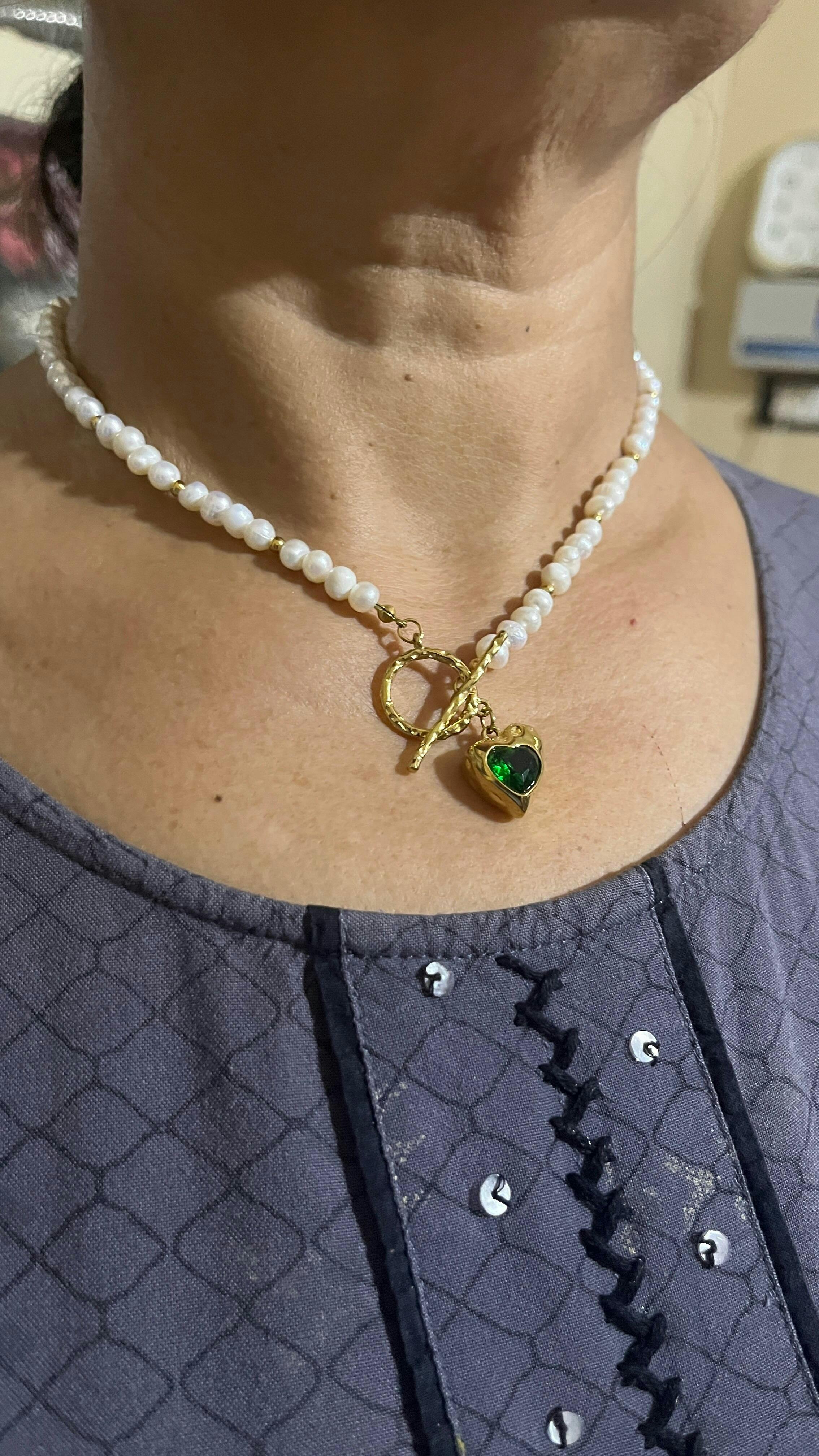 Elevate your look with this Demifine 18K Gold Plated Heart Pearl Necklace with Green Stone. Designed with natural freshwater pearls, a textured gold heart pendant, and a radiant green zircon centerpiece, this necklace is a balance of elegance and trend.